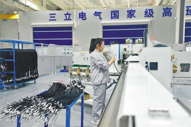咸阳市秦都区三立智能电气有限公司生产车间里,技术人员在操作全自动下线机(资料照片)。