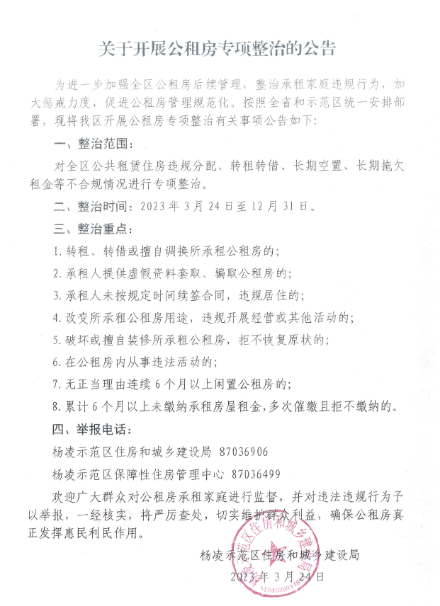 希望广大承租户积极配合,共同维护公租房和谐有序的良好环境。如果承租人有转租、转借或欠费行为,请主动前往杨凌示范区住房保障管理中心办理退房手续。如不主动退出,一经查实,将立即责令腾退房屋。希望广大市民共同监督举报投诉,共同制止公租房租赁中的违法违规行为,促进公租房市场规范化运营。