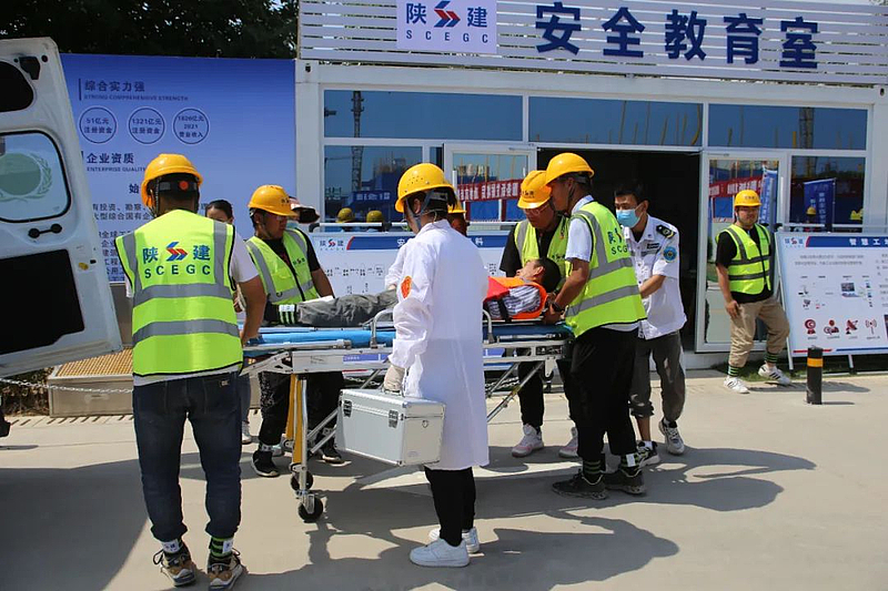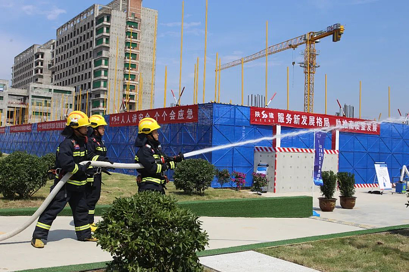 会议还进行了火灾事故及高处坠落应急救援演练、安全生产现场咨询活动,与会人员对示范区医院自贸院区项目安全文明施工进行了现场观摩。