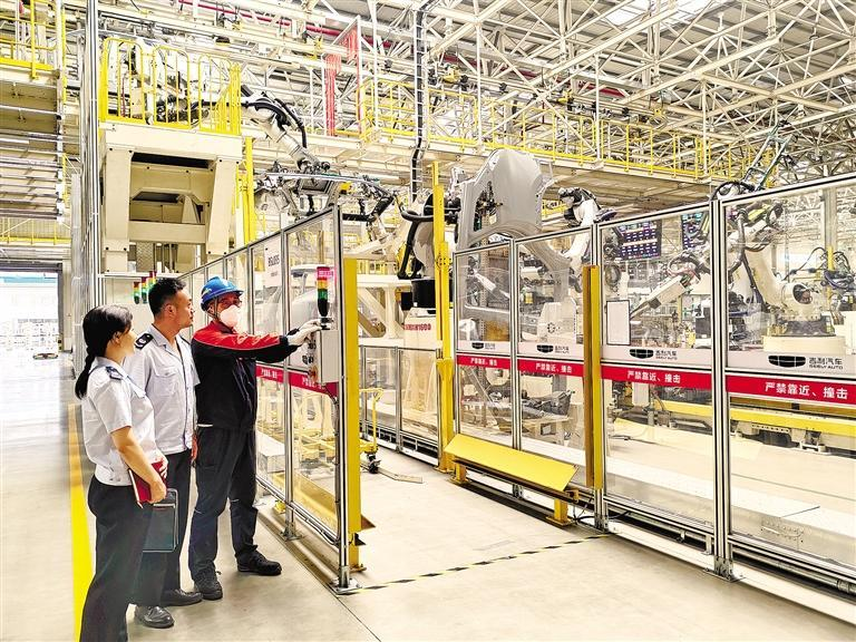 在吉利汽车宝鸡制造基地焊接车间,税务干部了解企业生产流程(资料照片)。 受访单位供图