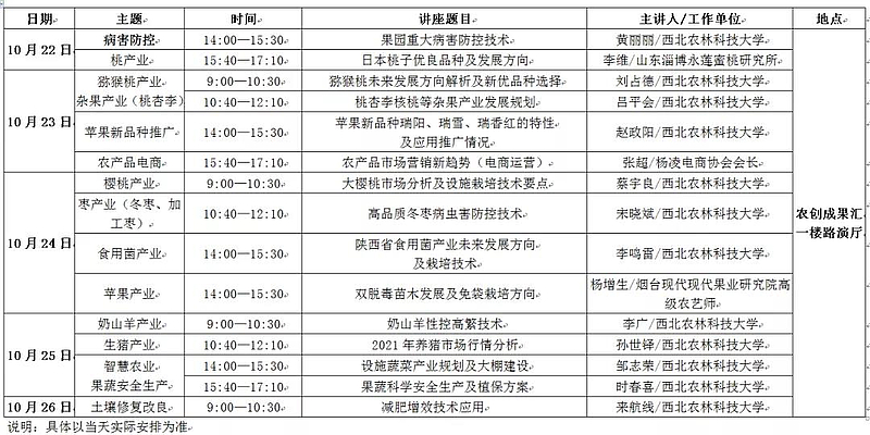 据了解,本届农高会期间将开展15场免费实用新技术培训讲座,地点设在农创成果汇一楼路演厅。此次讲座内容涵盖果树、设施蔬菜、食用菌、畜牧、电商、奶山羊、植保等多个专业。主办方将邀请西北农林科技大学、杨凌职业技术学院及外省具有丰富实践经验、长期深入生产一线的专家老师,针对实用新技术、市场动态、现代农业发展和农民科技需求等进行主讲,以帮助广大种植户解决难题,推动农业现代化、产业化发展。