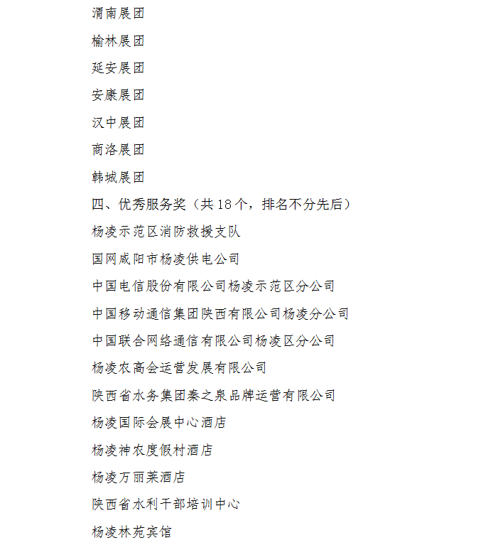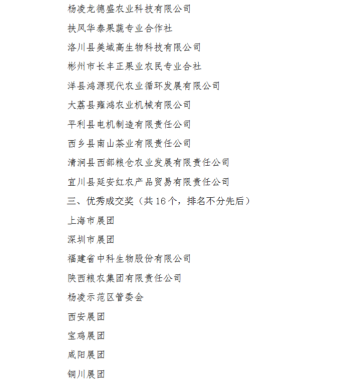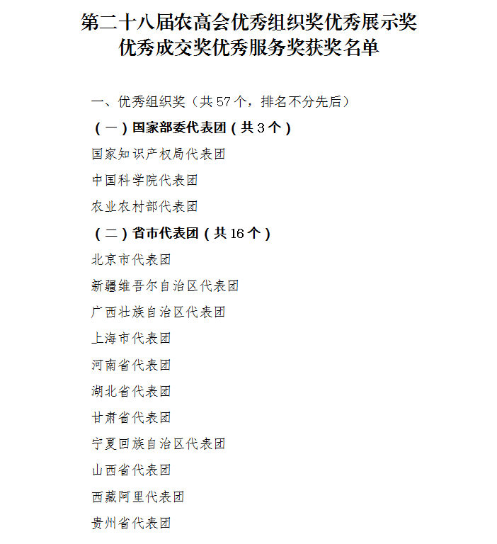 以“科技创新引领乡村振兴”为主题的第28届杨凌农高会于10月22日至26日成功举办。为期5天的会期里,各国家部委、省市代表团和机构企业等积极组织展团参展参会、促成交易,取得了显著的成绩,获得了满满的收益。经农高会组委会审议,评出57个优秀组织奖,158个优秀展示奖,16个优秀成交奖,18个优秀服务奖,现将名单予以公布。