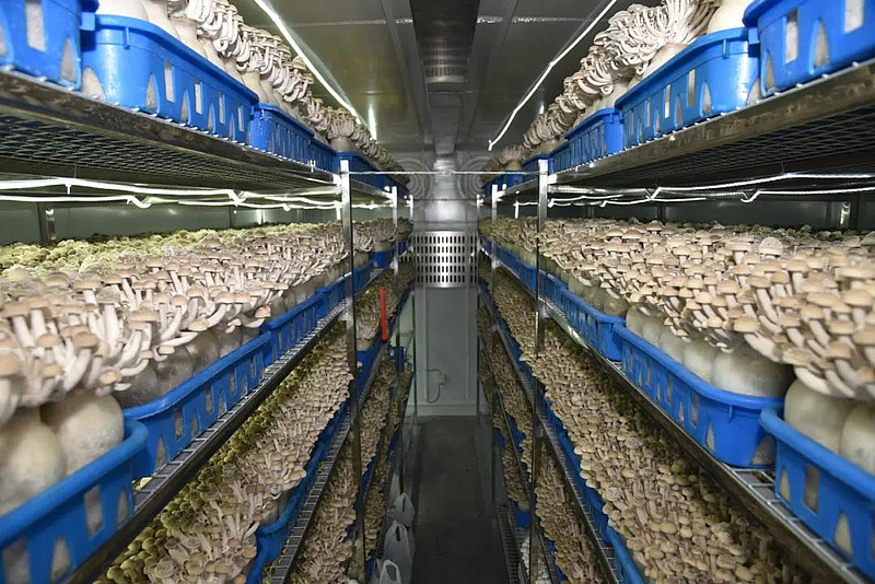 记者现场了解到,所谓“智慧云舱”,其实就是一个包含设备舱、种植箱的方舱,每个方舱27平方米,采用高密度立体化、瓶装方式种植食用菌,实际种植面积能够达到18立方米。