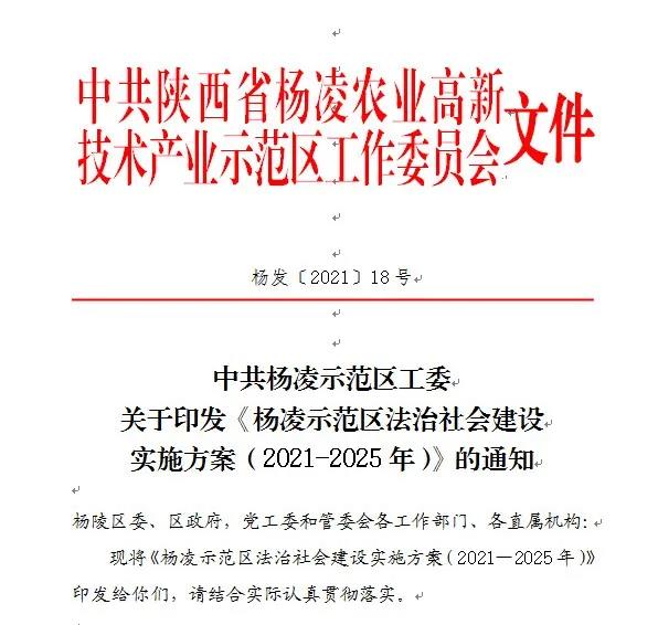 为加快建设更高水平法治杨凌,推动经济社会追赶超越发展,日前,杨凌示范区党工委印发《杨凌示范区法治社会建设实施方案(2021—2025年)》(以下简称《实施方案》),明确了未来5年法治社会建设的总体目标和重点举措,是新时代推进全区法治社会建设的路线图和任务书。