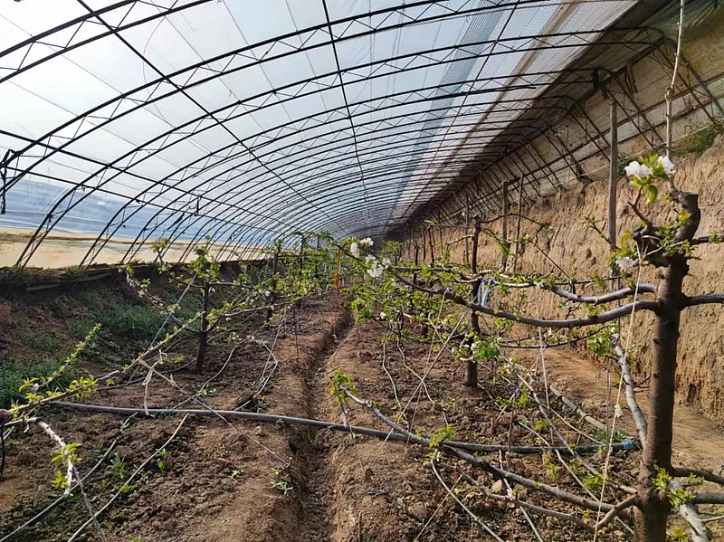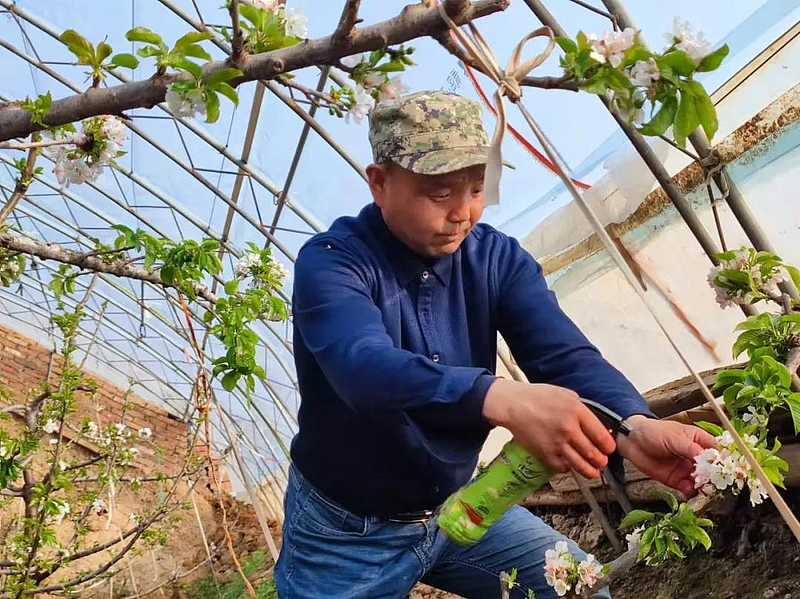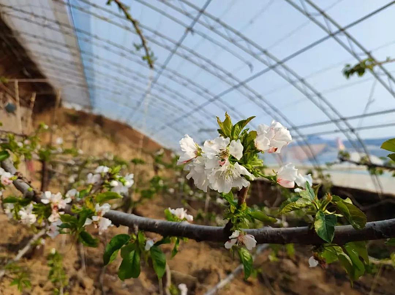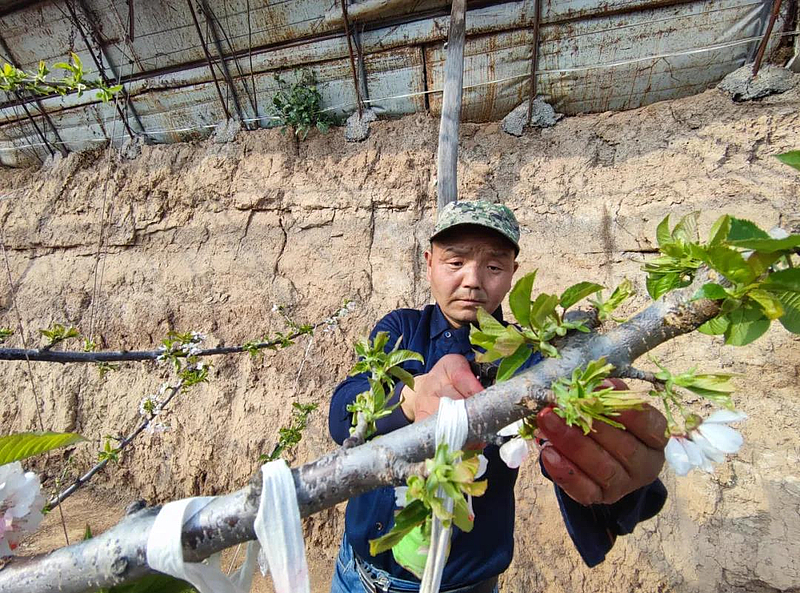 下午两点多,马高明的樱桃大棚内春意融融,樱桃树枝头上点点翠绿冒出了头,朵朵白花竞相绽放。在这盎然的春景中,老马正拿着自制的小喷壶,动作麻利地给花朵授粉。