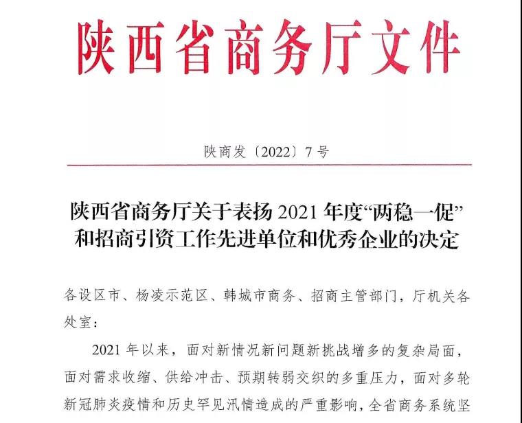日前,陕西省商务厅关于表扬2021年度“两稳一促”和招商引资工作先进单位和优秀企业中,杨凌示范区产业投资促进局为招商引资(外资)工作先进单位,麦肯食品(杨凌)有限责任公司为“优秀外资企业”,杨凌永泰电子商务有限公司为“优秀商贸企业”。