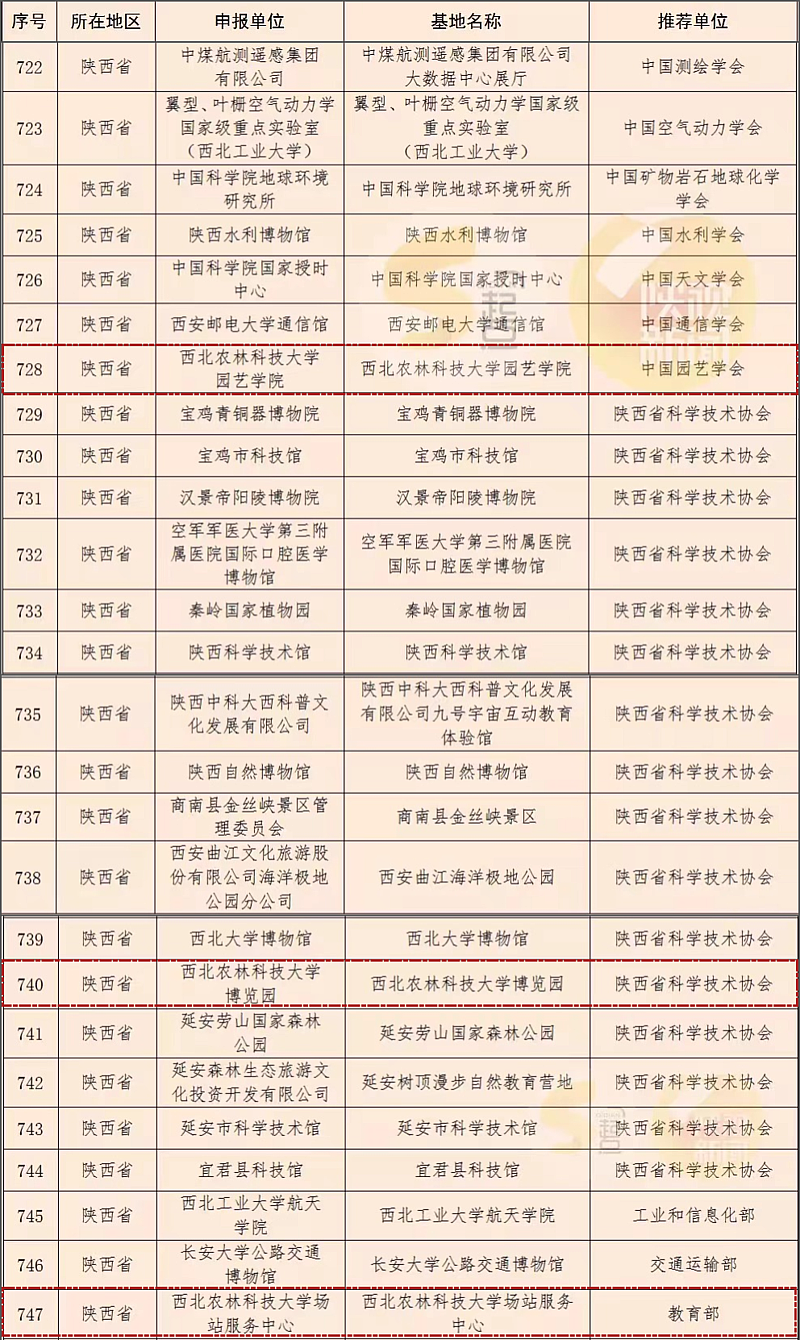 日前,中国科协认定800个单位为2021—2025年度第一批全国科普教育基地。经过初评、终评和公示等程序,中国科协决定命名中国科学院北京纳米能源与系统研究所(Maxwell科学+)、中国测绘科学研究院、中国地图出版社地图文化馆等800个单位为2021—2025年度第一批全国科普教育基地。其中,陕西26家单位入选,杨凌有3家单位名列其中,分别是西北农林科技大学园艺学院、西北农林科技大学博览园、西北农林科技大学场站服务中心。具体名单如下: