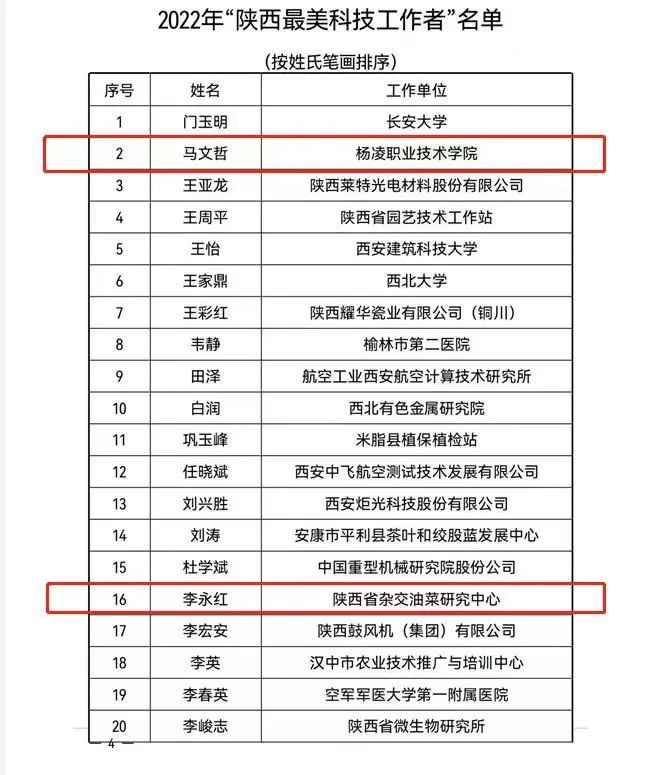 5月25日2022年“陕西最美科技工作者”名单发布,表彰了52名长期扎根陕西、服务基层一线、成绩突出的优秀科技工作者。其中,杨凌共有4人入选。分别是杨凌职院生物工程学院 马文哲、陕西省杂交油菜研究中心 李永红、西北农林科技大学农学院 柴岩、西北农林科技大学园艺学院 蔡宇良。一起来看看他们的先进事迹吧。