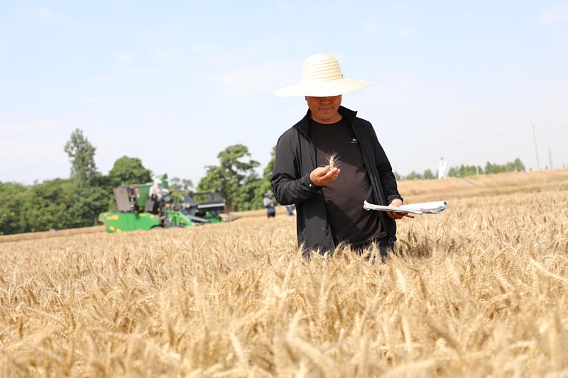 在30亩的小麦育种试验田里,收割机来回穿梭于金黄色的麦浪之间,机器轰鸣声不绝于耳,麦穗进入脱粒箱,麦秆被粉碎还田。西北农林科技大学农学院教授、小麦育种专家马翎健正在这片麦田里观察小麦穗粒。