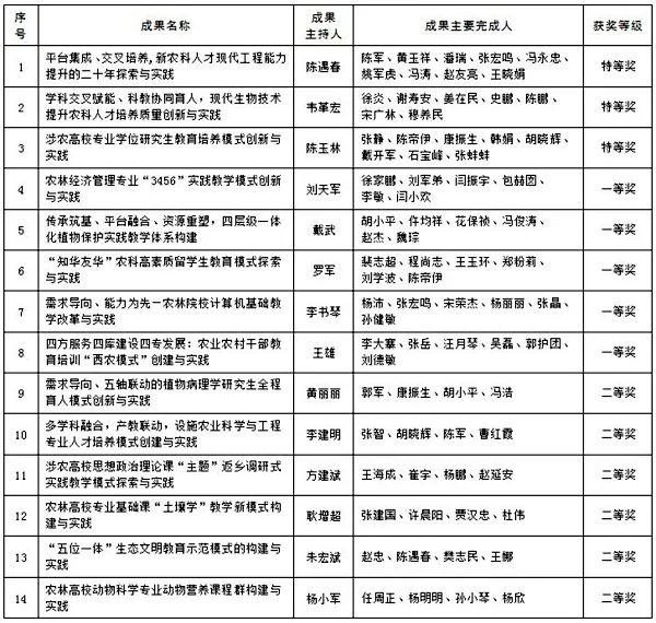 近日,陕西省人民政府办公厅发布了《关于表彰陕西省2021年高等教育教学成果奖获奖项目的通报》(陕政办函〔2022〕64号)。西北农林科技大学共斩获14项成果,其中特等奖3项,一等奖5项、二等奖6项。