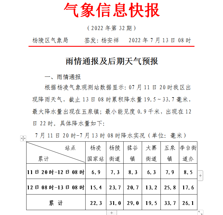 杨凌迎来本轮持续降水过程首次强降水天气,根据气象台数据显示,截至13日08时累积降水量19.5~33.7毫米,为了应对本次持续降水天气,全力保障人民群众的生命财产安全,杨凌各相关部门闻讯而动,第一时间筑牢人民群众生命财产安全堤坝。