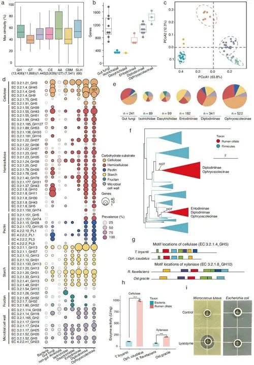 在52个纤毛虫基因组共预测到33,693个非冗余的CAZymes,其中99%都是未知的。每种瘤胃纤毛虫均具有独立降解植物结构性碳水化合物、非结构性碳水化合物以及微生物碳水化合物的能力。其中,双毛亚科和头毛亚科的物种基因组编码着与肠道真菌相当的CAZymes基因,且大部分的酶(72-82%)用于植物结构性碳水化合物的降解。分析发现约63%的瘤胃纤毛虫CAZymes通过水平转移获得,其中55%来自细菌和8%来自真菌。纤毛虫水平转移获得的CAZymes与供体间存在明显的结构差异,例如纤毛虫GH5家族的木聚糖酶和GH10家族的纤维素酶均丢失了一个motif。利用毕赤酵母过表达这两个酶发现,纤毛虫的纤维素酶和木聚糖酶的活性分别比其细菌供体高9倍和2倍。这种高活性反映了纤毛虫降解酶应用于生物质转化的巨大潜力。