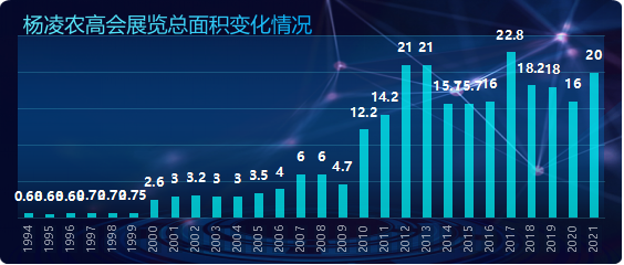 中国杨凌农业高新科技成果博览会(简称:农高会)始于1994年,已连续成功举办28届。近日,中国会展经济研究会公布了一份农高会综合评估报告。其中,有一组数据值得关注:展览面积从首届的6000㎡发展到第28届的200000㎡;招商引资金额从7.3亿元到近三年的1007亿元、1102.9亿元、906.44亿元;参会人数从12万人次到2021年的162万人次……