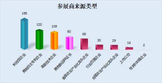 调查显示,参展商中科技型企业包括高新技术企业占比较高,达到52.68%;全国和省级农业产业化龙头企业、行业百强企业达22%以上;拥有自主专利和新品种证书企业35%以上。