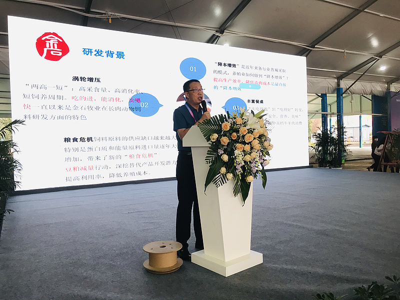 “我们的产品采用酶解发酵技术,可以提高饲料营养物质吸收利用率,能提高牛羊的采食量,降低料肉比,提高日增重。”