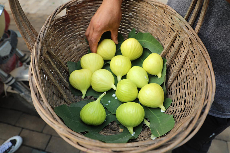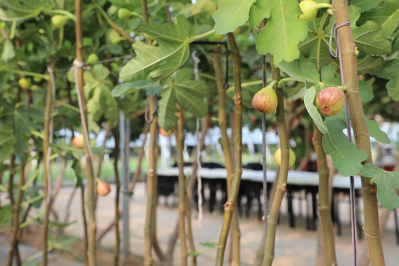 走进杨凌菲格无花果庄园,能感受到浓浓地田间展氛围,空气中萦绕着淡淡的无花果香,长桌上展示着无花果干、无花果酒、无花果果铺、无花果酱等深加工产品。