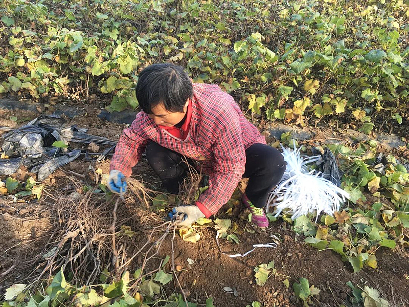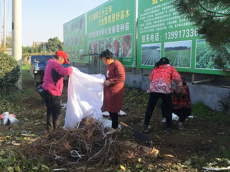 陕西杨凌示范区新集村是全国闻名的葡萄村,名优鲜食葡萄种植、葡萄育苗驰名省内外。眼下,正值葡萄苗木的销售旺季,11月14日,记者在杨凌金园葡萄专业合作社的育苗基地里看到,10多名工人正在将一棵棵根系发达的葡萄苗起苗、修剪、捆扎、装袋,合作社理事长陈敏儒在一旁进行指导,一片繁忙的景象。