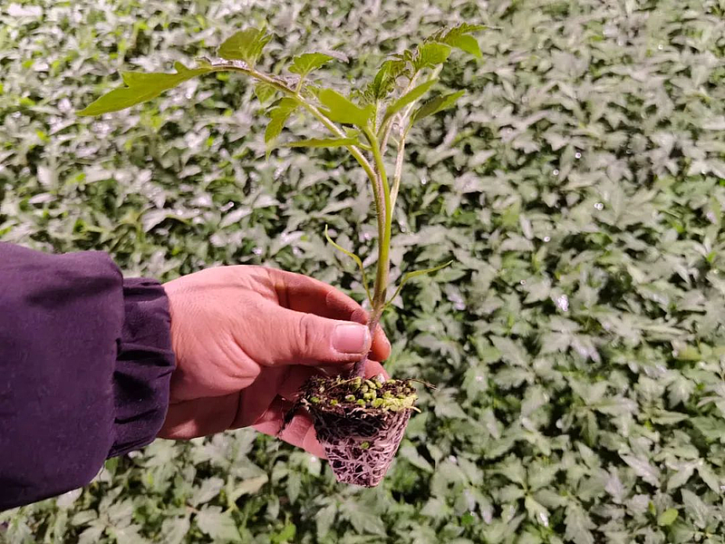 为了将育苗产业发展的更好,2016年,李建辉在杨凌职业技术学院上起了农民大学,经过三年的半脱产学习教育,他于2019年取得了大专毕业证书,也拥有了更加成熟的育苗技术。“你看这个苗子现在达到五叶一心了,根系发达、茎秆粗壮,看起来就是个健壮的苗子,这么大刚好就能定植了。”说话间,李建辉从基质盘拿起一株长势良好的西红柿苗,向记者娓娓道来它的长势情况。