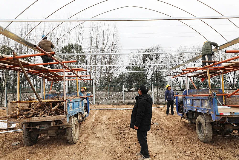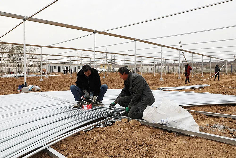 近日,记者在位于杨凌揉谷镇姜嫄村集体经济太秋甜柿种植项目(光明)基地看到,工人们正忙着搭建连栋大棚,施工现场机械轰鸣,一派热火朝天的建设场景。