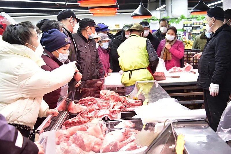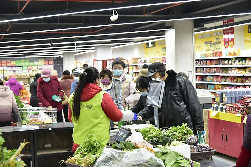 记者在超市里看到,工作人员在忙碌地整理货品,引导顾客;顾客们忙着选购自己心仪的商品,尤其是在生鲜区,围满了买菜买肉的顾客。