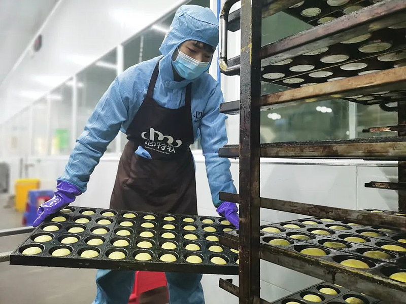 1月11日上午,记者走进心特软食品科技开发有限公司的生产车间,机器运转声不绝于耳,50余名头戴蓝色帽子、身穿制服的工人各司其职忙碌着,经过他们的严格把控,不多时,色泽金黄、香味诱人的糕点就成功制作出来。
