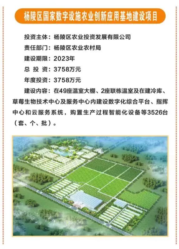 1.杨陵区国家数字设施农业创新应用基地建设项目,总投资3758万元,由杨陵区农投公司投资,主要建设数字化综合平台、指挥中心和云服务系统,购置生产过程智能化设备等。