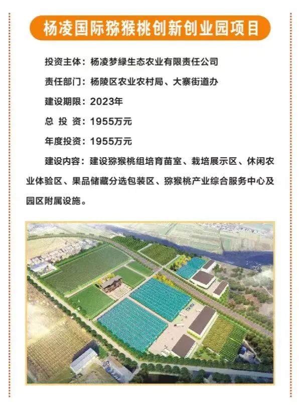 2.杨凌国际猕猴桃创新创业园项目,总投资1955万元,由杨凌梦绿生态农业有限责任公司投资,主要建设猕猴桃组培育苗室、栽培展示区、休闲农业体验区、果品储藏分选包装区、猕猴桃产业综合服务中心及园区附属设施。