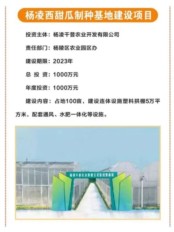 3.杨凌西甜瓜制种基地建设项目,占地100亩,总投资1000万元,由杨凌千普农业开发有限公司投资,主要建设连体设施塑料拱棚5万平方米,配套通风、水肥一体化等设施。