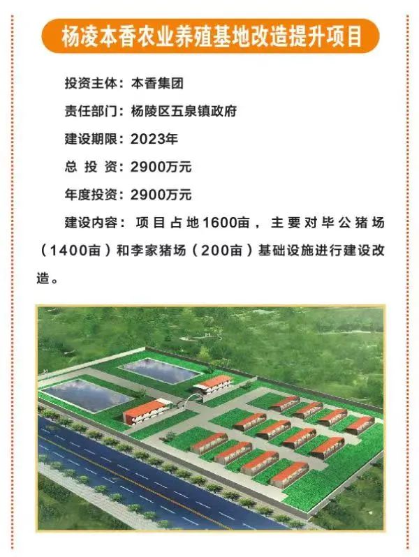 5.杨凌本香农业养殖基地改造提升项目,占地1600亩,总投资2900万元,由本香集团投资,主要对毕公猪场和李家猪场基础设施进行建设改造。