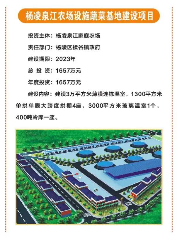 6.杨凌泉江农场设施蔬菜基地建设项目,总投资1657万元,由杨凌泉江家庭农场投资,主要建设薄膜连栋温室、单拱单膜大跨度拱棚、玻璃温室、冷库等。