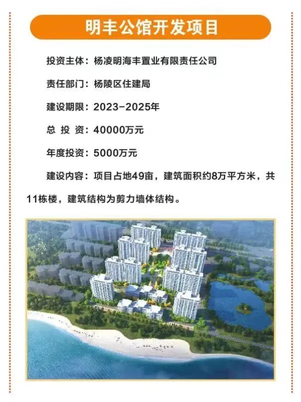 8.明丰公馆开发项目,占地49亩,总投资4亿元,由杨凌明海丰置业有限责任公司投资,主要建设11栋商住楼及配套设施,建筑面积约8万平方米。