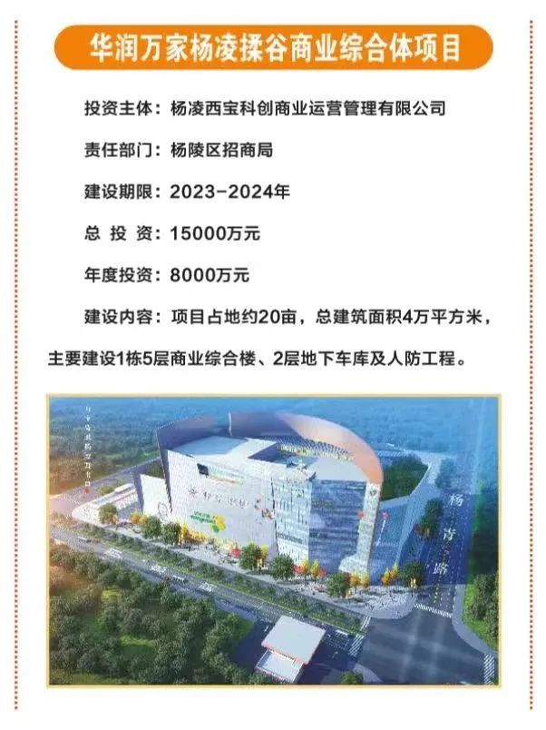 9.华润万家杨凌揉谷商业综合体项目,占地20亩,总投资1.5亿元,由杨凌西宝科创商业运营管理有限公司投资,主要建设1栋5层商业综合楼、2层地下车库及人防工程,总建筑面积4万平方米。
