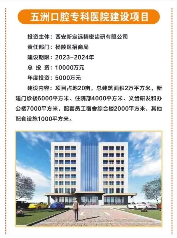 10.五洲口腔专科医院建设项目,占地20亩,总投资1亿元,由西安新定远精密齿研有限公司投资,主要建设门诊楼、住院部、义齿研发和办公楼、员工宿舍综合楼等,总建筑面积2万平方米。