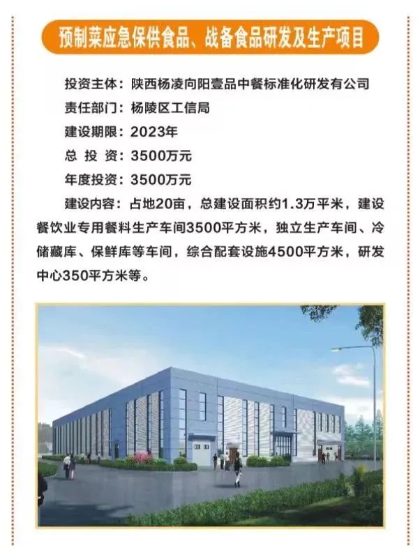 11.预制菜应急保供食品、战备食品研发及生产项目,占地20亩,总投资3500万元,由陕西杨凌向阳壹品中餐标准化研发有限公司投资,主要建设餐饮业专用餐料生产车间、独立生产车间、冷储藏库、保鲜库、研发中心及配套设施,总建设面积约1.3万平米。