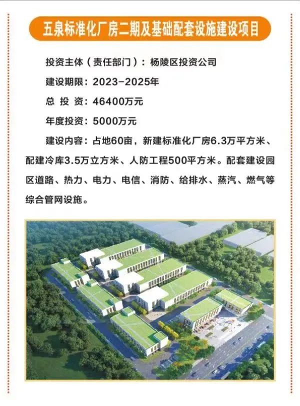 13.五泉标准化厂房二期及基础配套设施项目,占地60亩,总投资4.64亿元,由杨陵区投资公司投资,主要建设标准化厂房6.3万平方米、配建冷库3.5万立方米、人防工程500平方米,并配套建设园区道路、电力、热力、给排水等基础设施。