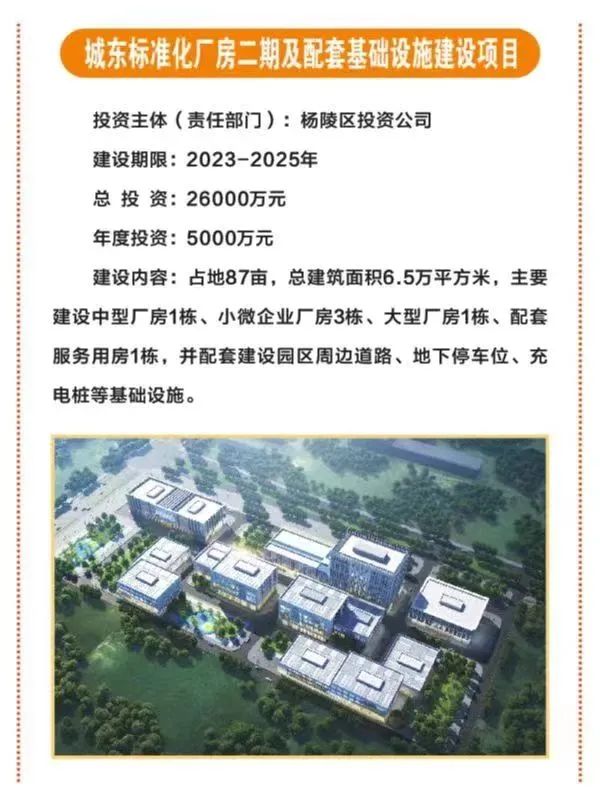 14.城东标准化厂房二期及配套基础设施项目,占地87亩,总投资2.6亿元,由杨陵区投资公司投资,主要建设中型厂房1栋、小微企业厂房3栋、大型厂房1栋、配套服务用房1栋,并配套建设园区周边道路、地下停车位、充电桩等基础设施。