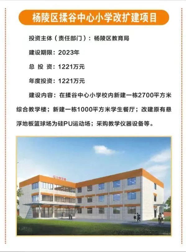 15.杨陵区揉谷中心小学改扩建项目,总投资1221万元,由杨陵区教育局投资,在揉谷中心小学校内新建一栋2700平方米综合教学楼、一栋1000平方米学生餐厅,改建原有运动场、采购教学仪器设备等。