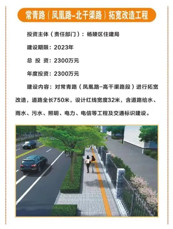 17.常青路(凤凰路-北干渠路)拓宽改造工程,总投资2300万元,由杨陵区住建局投资,主要对常青路(凤凰路-高干渠路段)进行拓宽改造,道路全长750米。