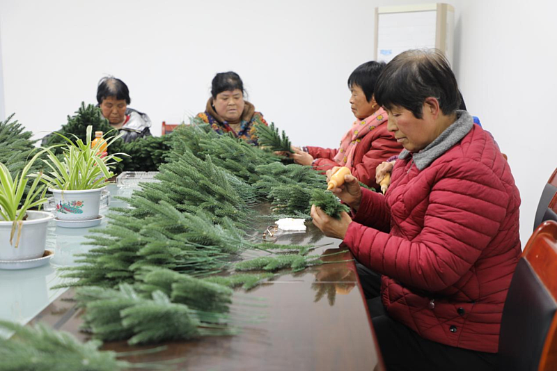 走进杨陵区杨陵街道北杨村村委会,一群五六十岁的大妈正忙碌着给圣诞树的叶芯涂抹黄色颜料,动作利落、娴熟。