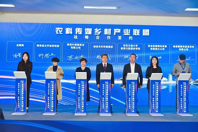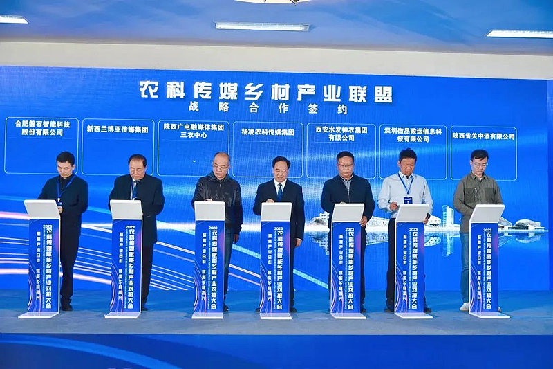 以项目为纽带,会议现场,国内外30余家企事业单位、主流媒体、科研院校进行了战略合作签约,共同探讨农科传媒赋能乡村产业振兴的全新模式,涵盖传媒、农服、农文旅、数字、影视等五大产业。为陕西雅泰乳业有限公司等10个2023年首批“乡村振兴科技(产业)示范基地”授牌。