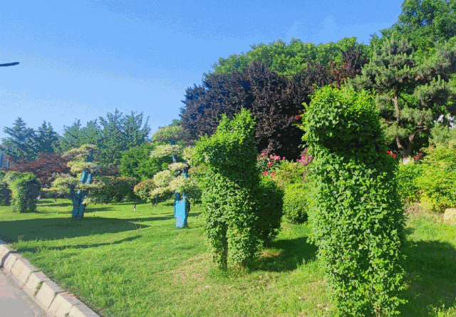 造型多样、颜色鲜明的绿化小品与街角环境融为一体,让人赏心悦目。散落在街头的绿篱、草坪既满足道路绿化的降噪、防尘、遮阳和分隔功能,还能满足过往行人的赏景需求。