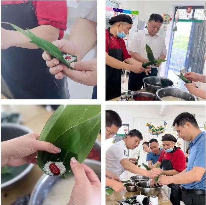 活动现场,职工餐厅早已为大家提前准备了浸泡好的糯米、红枣、粽绳、粽叶等材料,大家围在一起包粽子,手中的粽叶飞舞飘香,忙得不亦乐乎。不一会儿,正方形、三角形、长条形,各式各样的粽子陆续诞生。