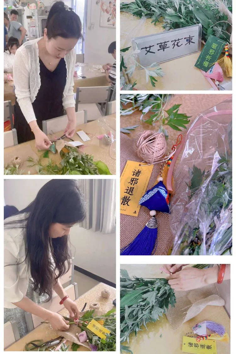俗话说:“午节采艾,悬于户上,可禳毒气”,大家用艾叶、黄金球、玉簪、菖蒲等材料,并配上香包、彩带、吊牌等装饰物,制作成了一束束美丽的艾草花束。