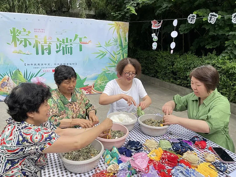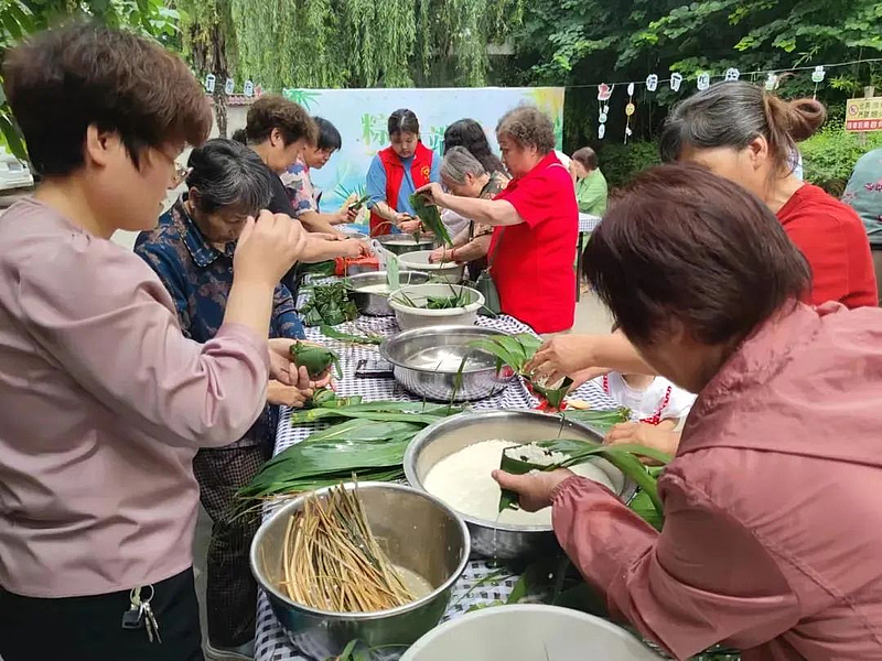 活动现场,老人、志愿者和社区工作人员们一起包起粽子。他们将粽叶卷成漏斗状,装好糯米和红枣,用细绳一绕、一捆,一个三角形的粽子就诞生了。随后,大家一起品尝煮熟的粽子,现场一片欢声笑语。