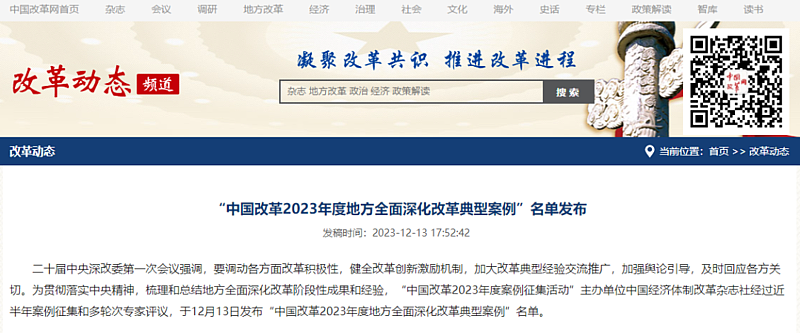记者了解到,“中国改革年度地方全面深化改革典型案例”评选由中国经济体制改革杂志社主办,是国家改革发展领域最高荣誉,已连续举办15届。
