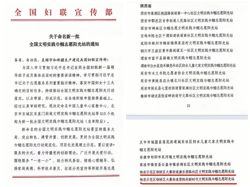 日前,全国妇联宣传部下发通知,公布新一批全国文明实践巾帼志愿阳光站名单,杨凌示范区杨陵区大寨街道康乐西路社区文明实践巾帼志愿阳光站、大寨街道黎陈村新时代文明实践巾帼志愿阳光站2个站点入选。