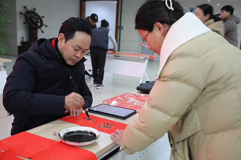 活动现场,长桌排开,红幅铺展,墨香飘溢,气氛热烈。只见书法家们笔锋婉转,妙句成双:“龙腾虎跃千家喜,雨顺风调万户春”“迎春迎福迎富贵,接财接福接平安”“天增岁月人增寿,春满乾坤福满楼”……不一会儿功夫,一幅幅寓意吉祥的春联和一个个饱含神韵的“福”字就依次送入人们手中,也让大家在热闹祥和的氛围中提前感受到浓浓的“年味”。