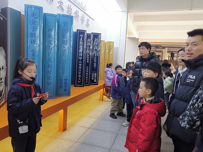 “文化寻根,薪火相传。崇尚科学,追求真理。大家好,我为四小代言,我是杨凌高新第四小学二年级十班管梓涵。在我身后的就是科学家文化长廊,这是一个充满智慧和奇迹的地方,看着一本本伟大的科学家书籍,爱因斯坦、牛顿、李时珍、钱学森等科学家们,似乎就站在我们面前,这个长廊就像是一条时光隧道,带领我们穿越历史,去了解那些为人类进步作出巨大贡献的科学家们……”一位小讲解员带领同学、家长们“穿越时空”,重温科学巨匠们的故事。