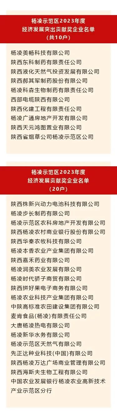 据了解,会议隆重表彰了2023年度经济发展突出贡献奖和经济发展贡献奖企业,杨凌美畅科技有限公司等10家企业荣获“杨凌示范区2023年度经济发展突出贡献奖”,每家企业给予20万元奖励;陕西株新兴动力电池科技有限公司等20家企业荣获“杨凌示范区2023年度经济发展贡献奖”,每家企业给予10万元奖励,奖励资金共计400万元。