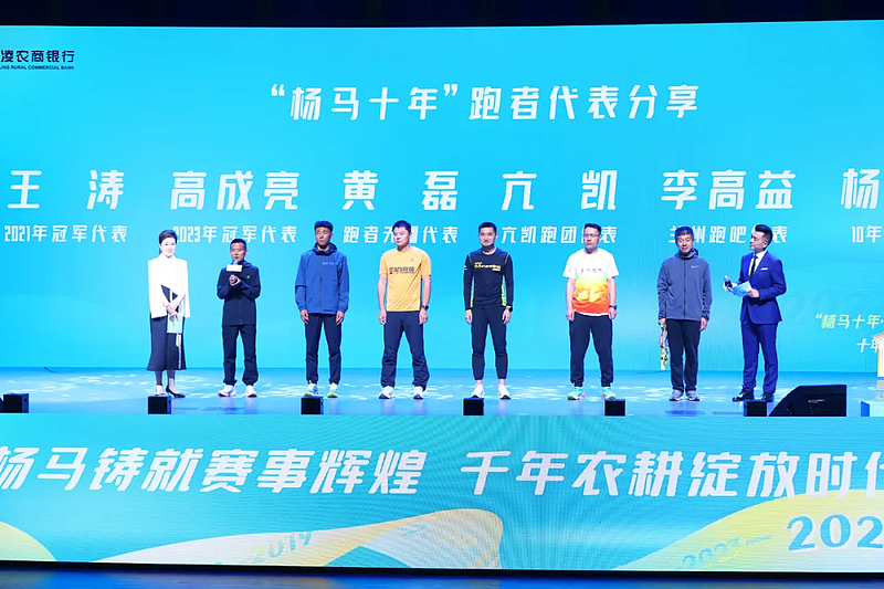 2021杨马冠军代表王涛,2023杨马冠军代表高成亮,兰州跑吧代表李高益,亢凯跑团代表亢凯,跑者无疆代表黄磊以及10 年杨马跑者:梁红杰、李迁移、朱卫兵、王长胜(春老)、杨建民获得“杨马十年•跑者之星”奖项。